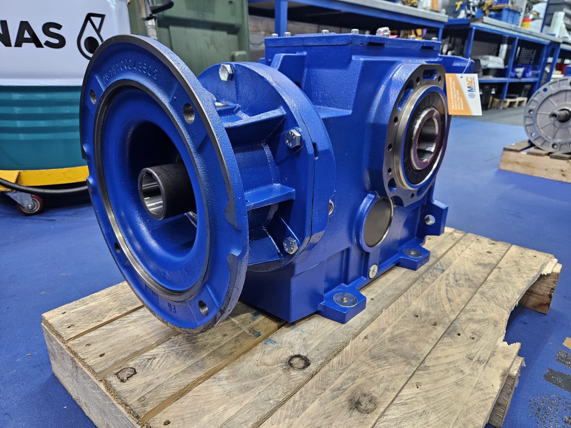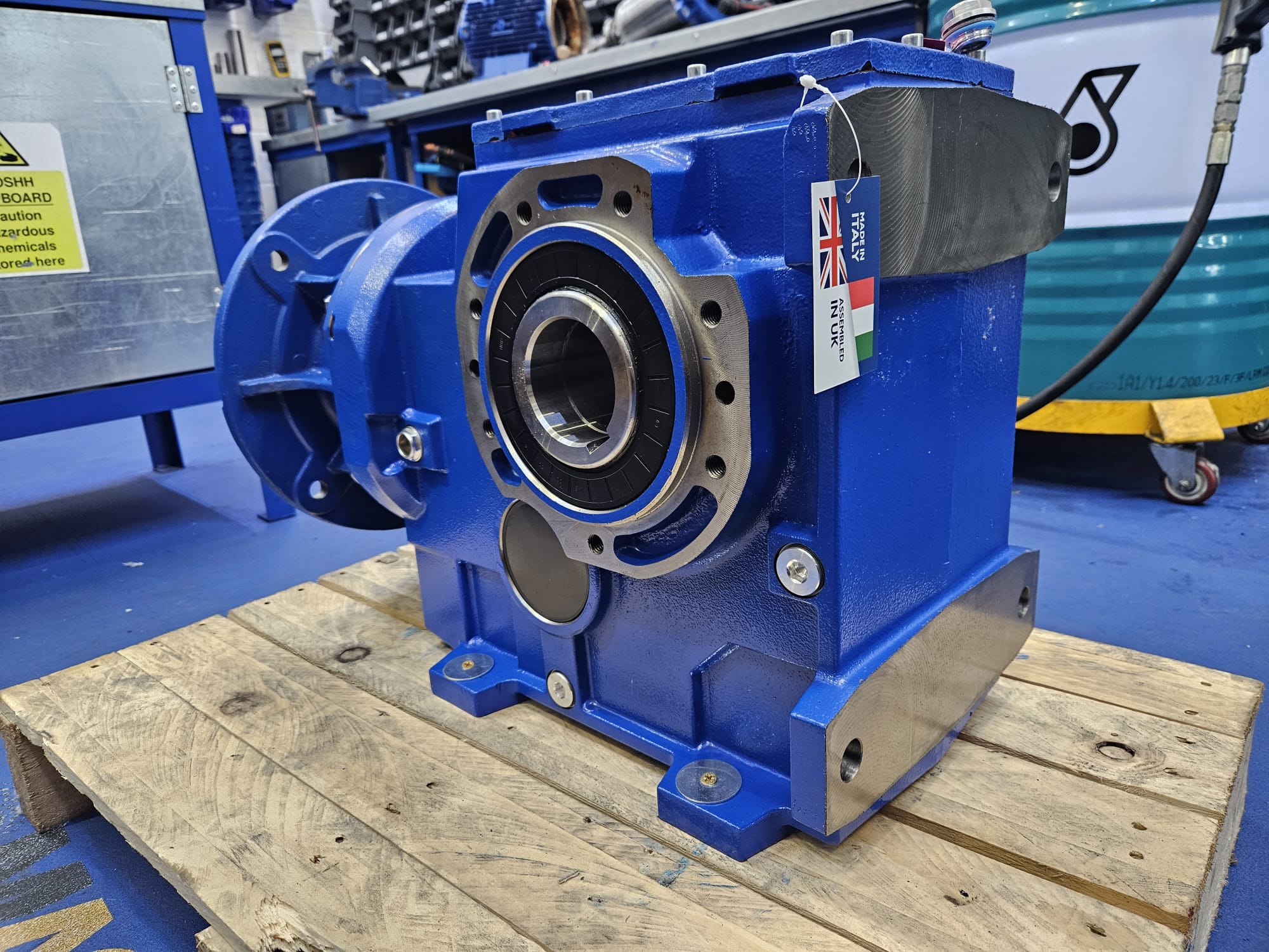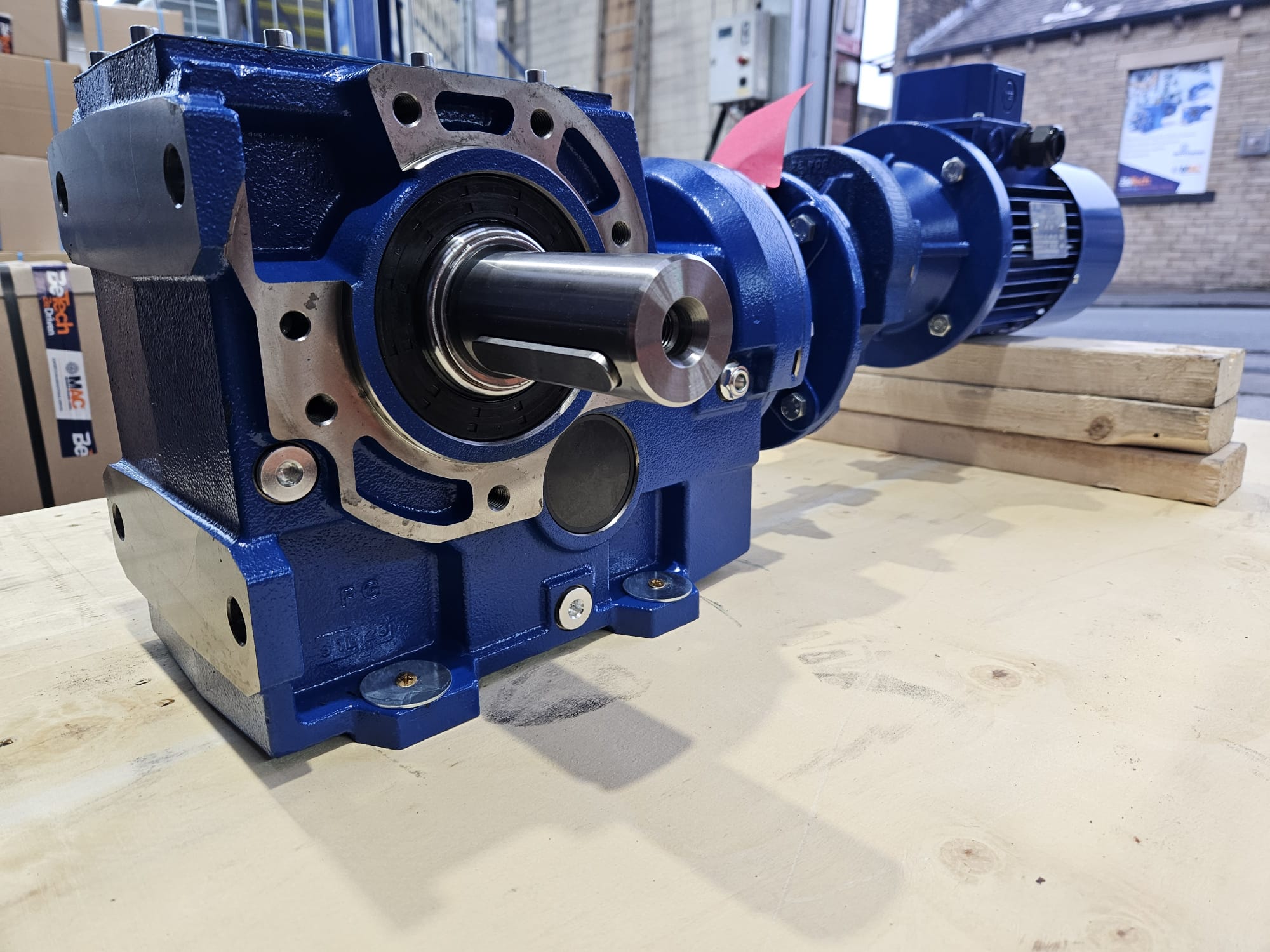 Motovario B143 with backstop for clockwise rotation only, with 70mm hollow bore. Built from stock in the afternoon, ready for an early morning collection by the customer.