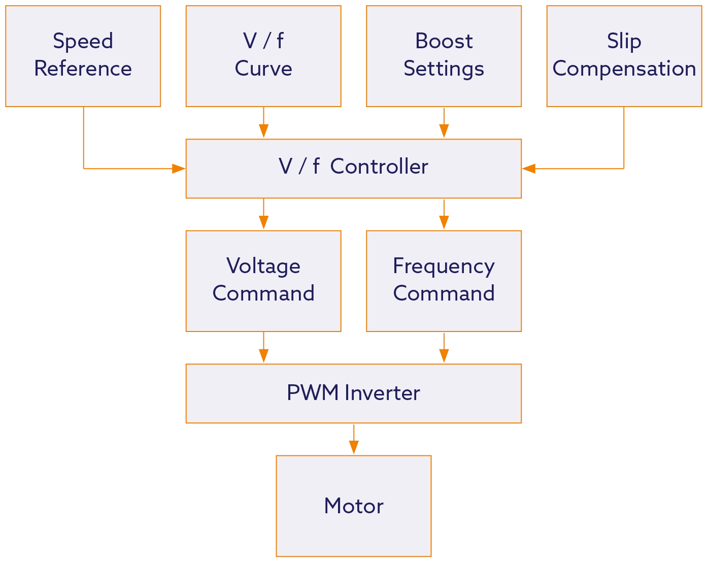 Voltage/Frequency control — often referred to as scalar control — maintains a constant ratio between output voltage and frequency to preserve motor flux. It is the simplest form of VFD control, ideal for applications where speed regulation requirements are modest and load torque characteristics are predictable.