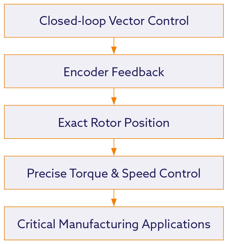 For the highest levels of precision, closed-loop vector control adds a physical feedback device to the system, providing the drive with exact information about the motor’s state.