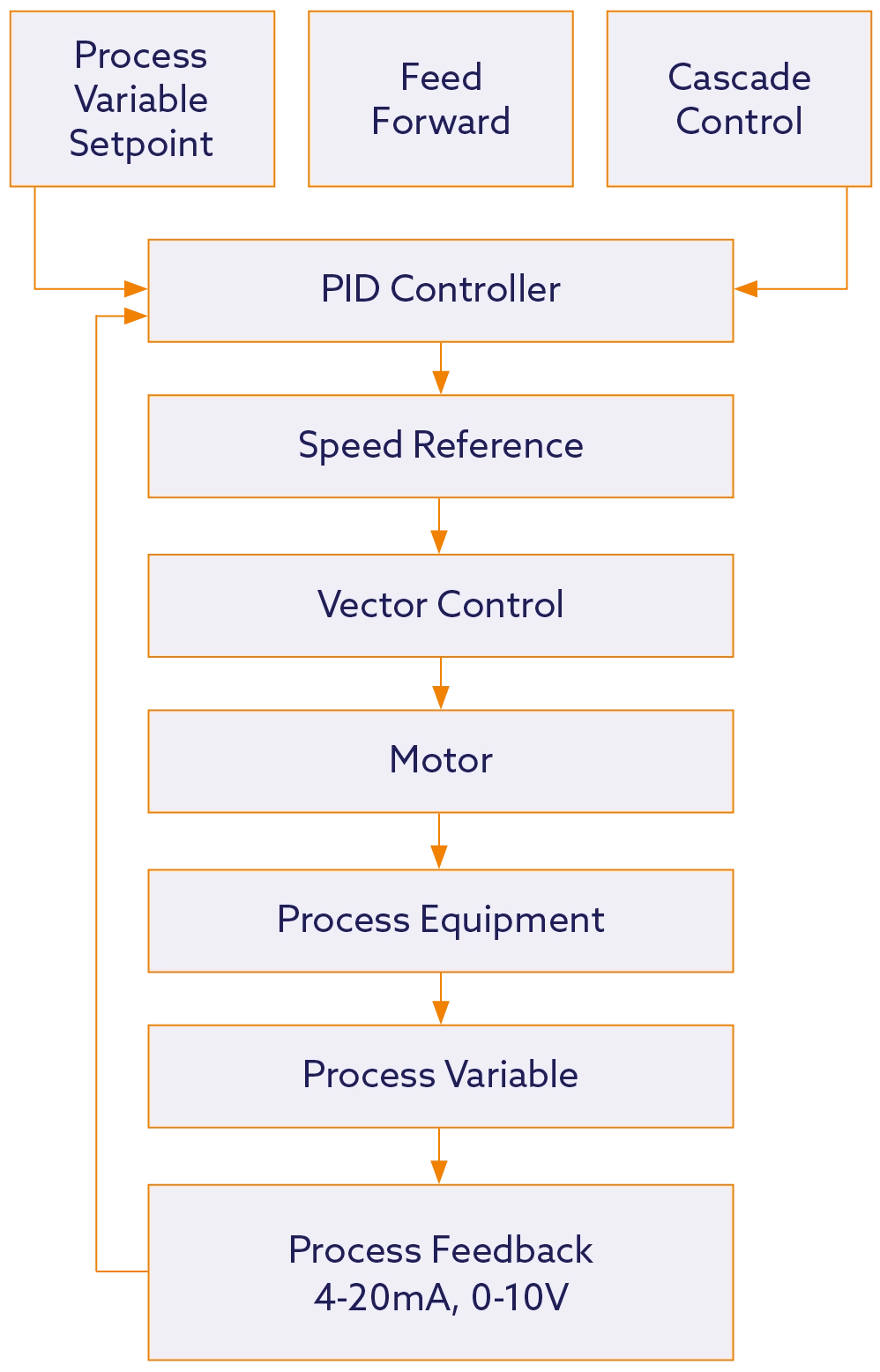 The VFD includes a built-in Proportional-Integral-Derivative (PID) controller. It can receive a process feedback signal (e.g., from a pressure, flow, or temperature transmitter) and compare it to a desired setpoint. The PID logic then automatically adjusts the motor speed to eliminate the error and maintain the process variable at the setpoint, removing the need for an external PLC for simple loop control.